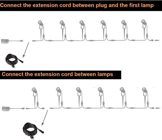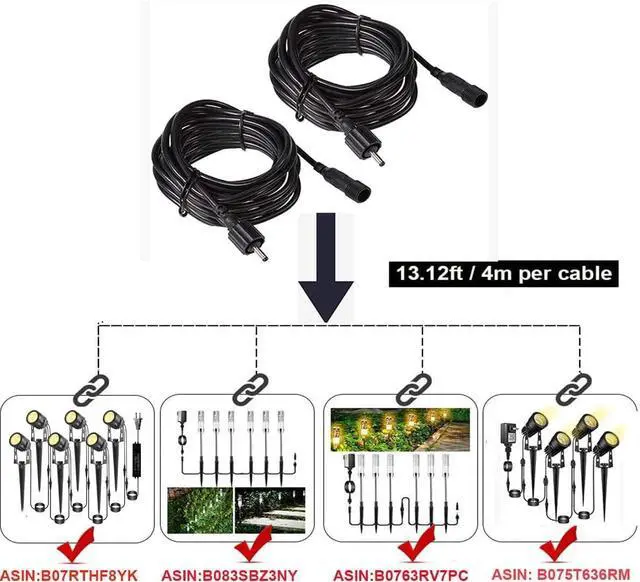 2 Pack 4m/ 13.12 ft extension cord for GreenClick landscape lighting spotlights( B07RTHF8YK, B075T636RM) and led path lights(B0763RV7PC, B083SBZ3NY). It is recommended that the connected extension cable should not exceed 39ft, or the long cable will weaken the current and reduce the brightness of the light.