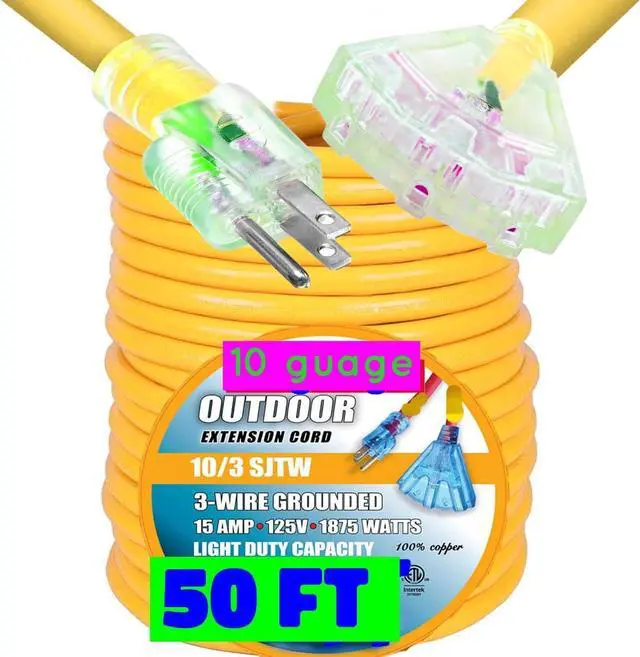 50ft extension cord 10/3 10 gauge extension cord 50 ft Extra HEAVY DUTY yellow outdoor jacket 10 3 extension cord Rated up to 1875 Watts