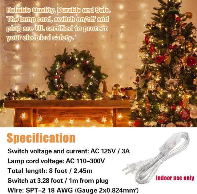 : Indoor use only. SPT-2 18 AWG (Gauge 2x 0.824 mm²). North American standard 2-pin polarized plug, 2 conductive tin plated copper cord wire. Lamp cord with switch total length 8 feet / 2.45 m, switch at 3.28 feet / 1m from plug.