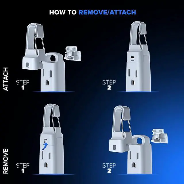 Removable Easy-Hook System, comes right off. Just flip the tab on the hooks base to separate the two detachable pieces. Snap them back together through the top hole of the extension cord when you need the hook again. No more bending over to reach the extension cord outlet! Clip our unique easy-hook hanging extension cord anywhere. can be hung at easy access heights on garage walls, workstations, construction sites, bedrooms, work areas, offices, and more.