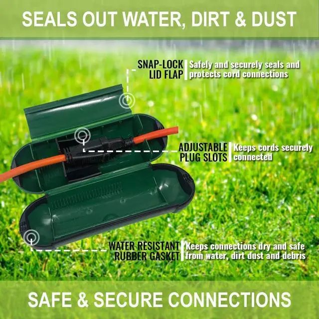 EASY TO USE: Simple, practical, and effectivejust connect your cords, place into the safety seal and close, no tools or installation required; A snap-lock lid flap and adjustable cord slots keep your cords securely connected and in place even when tugging on cords while using power tools and equipment during lawn and garden work