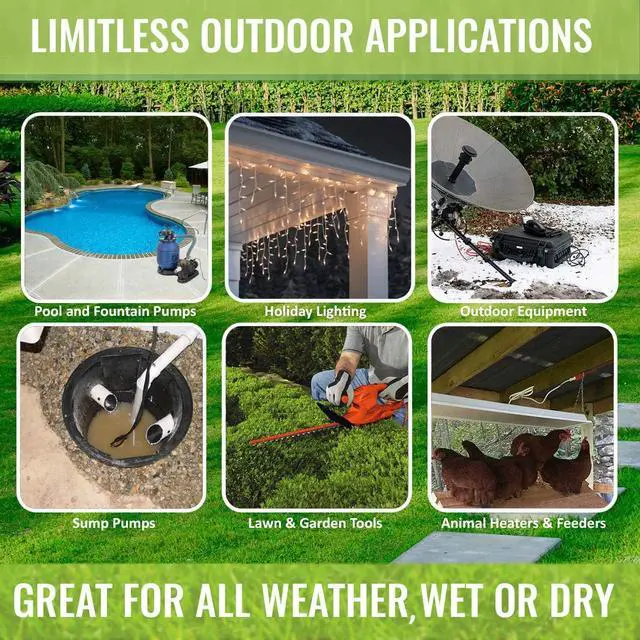 MULTIPURPOSE USE: Highly versatile and is perfect for both indoor and outdoor use; Great for Christmas lights, Halloween lights and string lights, water fountain and pool pumps, air conditioners, heaters, security cameras and more; Compatible with all cord sizes 12-gauge and smaller