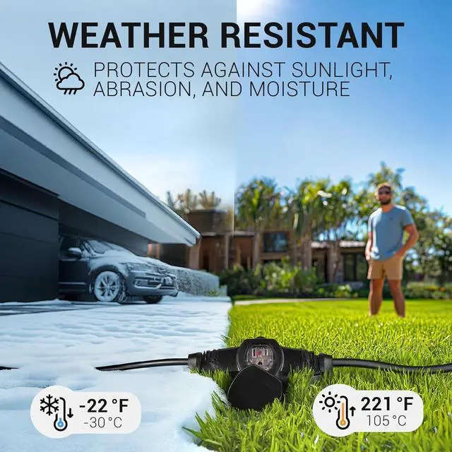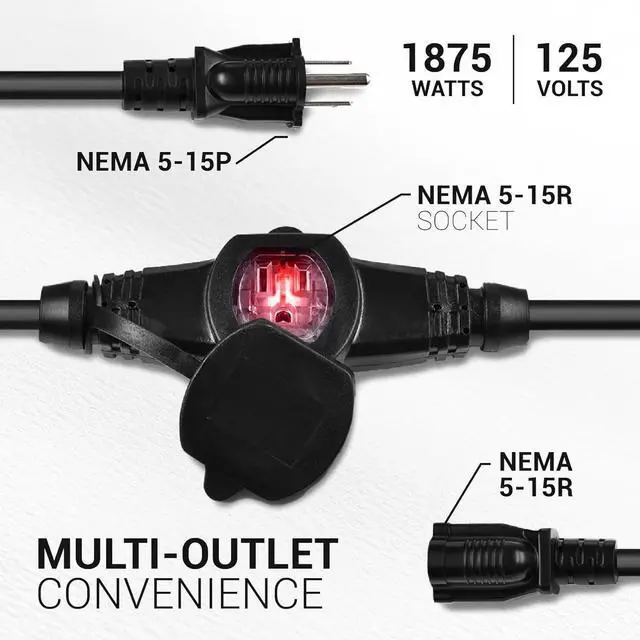 ENHANCED SAFETY FEATURES: Each outlet includes a cap to protect against debris, making it suitable for various conditions. Red LED indicators on each outlet provide clear visibility of power status.