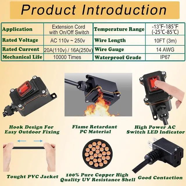 HEAVY-DUTY SWITCH: Our waterproof plug-in switch has a lifespan of over 10000 times. The shell is made of high quality flame-retardant PA66 material, characterized with high tensile strength, flame retardant, and electrical insulation. The cable adopts 14 AWG heavy-duty cable and 100% genuine copper wire, which is more durable, sturdy, and reliable in quality. The cable specification is 14AWG 10FT/3M.