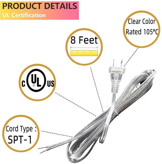 WELL BUILT REPLACEMENT LAMP CORD: Heavy 18 gauge wiring, UL listed, US plug, tinned end, rated 105°C, full 8 foot length( 2.44 m), transparent color for refurbished old lamp.