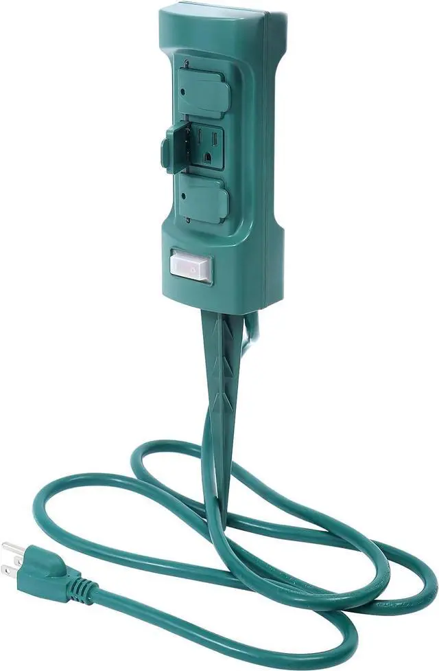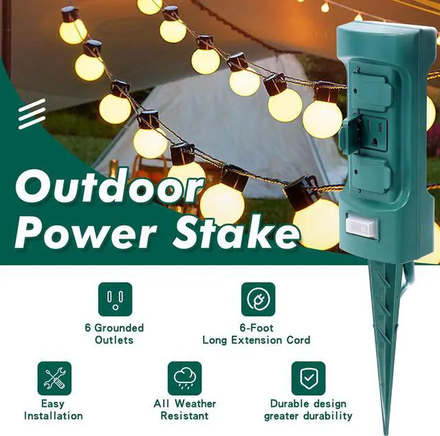 Features 6 outlet double sided power stake with covers and industrial grade 14 AWG x 3 cord SJTW weatherproof 6-foot cord