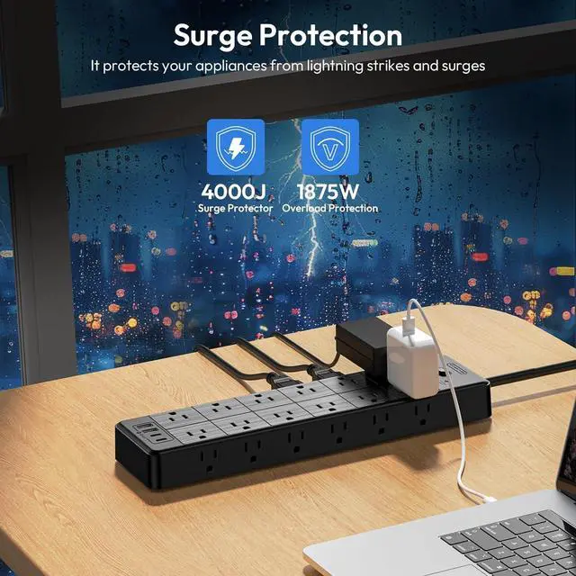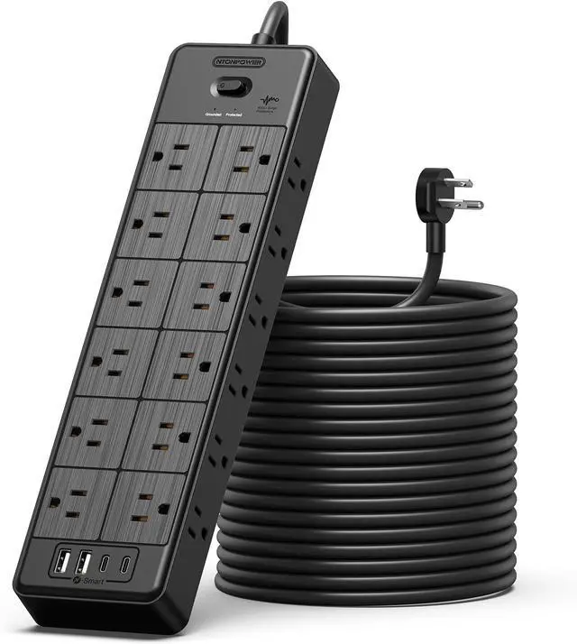 28-in-1 Extension Cord Surge ProtectorThe extension cord surge protector can meet all your power needs at once as it has 24 grounded 3 prong outlets and 4 USB ports. Connect to all your gaming or media setups, surround sound systems, TVs, phones, tablets, PCs, laptops and other devices with just one power strips with surge protection. You' ll have a neat gaming nook and home office.