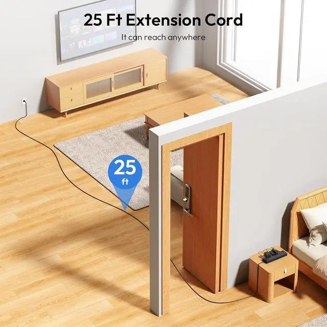 25 Ft Extension CordIf you have few outlets in your home, you know how difficult it is when you want to charge your phone anytime and anywhere. The extension cord 25 ft can provide the perfect solution, providing the flexibility to connect to distant outlets and hard-to-reach places. With its 0.53 -Inch flat plug, it can be easily installed in small spaces behind furniture, bookshelves, and tables, saving a lot of space.