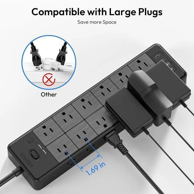 1.69 -Inch Wide OutletsThe 1.69 -inch wide spacing is ideal for fitting large plugs and power adapters without any obstructions. With outlets on three sides and four rows, you can easily plug in multiple power cords in different orientations. The black extension cord help you keep your cords organized, accommodate multiple adapters, save space, and reduce clutter.