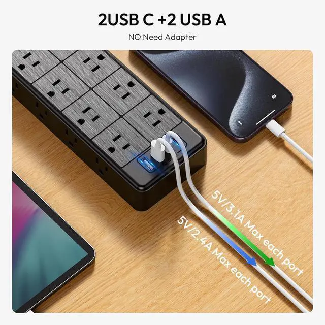 2 USB-C & 2 USB-A PortsAre you tired of looking for an adapter when your phone battery is low? Our USB power strip comes with 2 USB-C ports and 2 USB-A ports, making it a breeze to charge your mobile phones, smartwatches, tablets, cameras, and other gadgets without the hassle of multiple adapters. With built-in intelligent charging technology, the USB ports can automatically identify your devices and deliver the optimal and safe charging speed. (Total output 5V 3.1A, USB-A: 5V 2.4A )