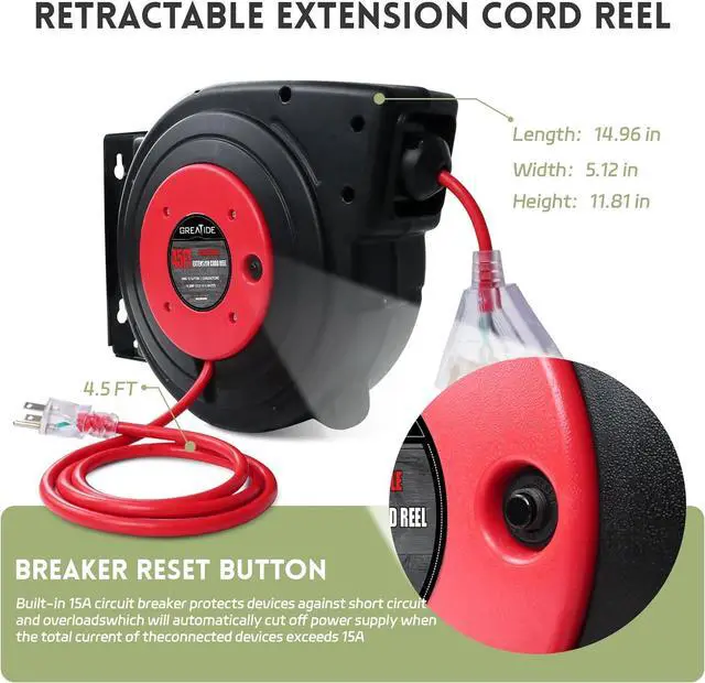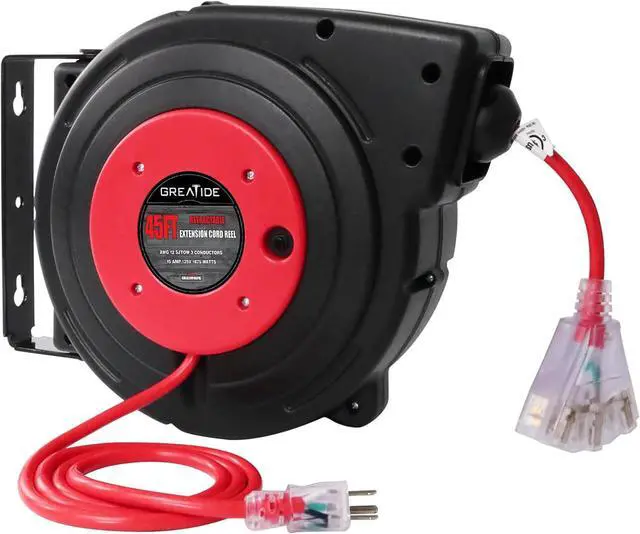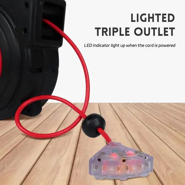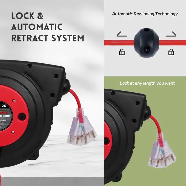 Easy & Efficient Use - 180°Swivel mounting brackets are included, so you can easily install the retractable extension cord reel where you want, such as on your garage ceiling or wall; This cord reel can automatic retract, you can lock the cord at any length, convenient for your use; 3 outlets in 1 for multiple use.