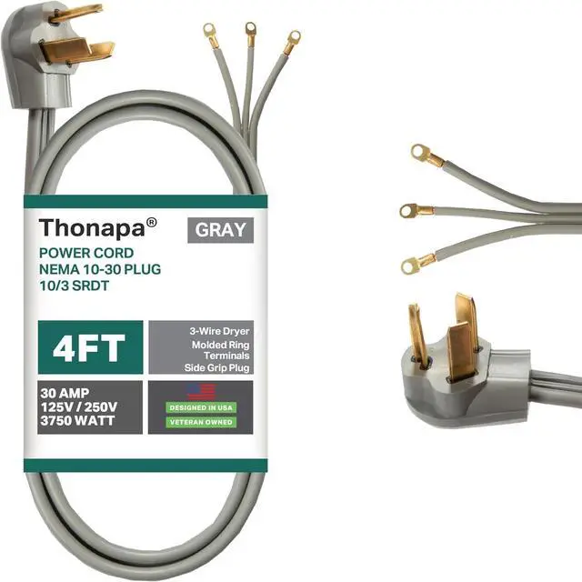 CORDS ARE ETL LISTED, 3 wire dryer cord 3 prong, 10 gauge, 4 foot, 30 amp, 125/250 volt, 3750 watt, NEMA 10-30, SRDT. VETERAN OWNED.