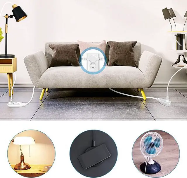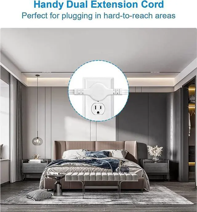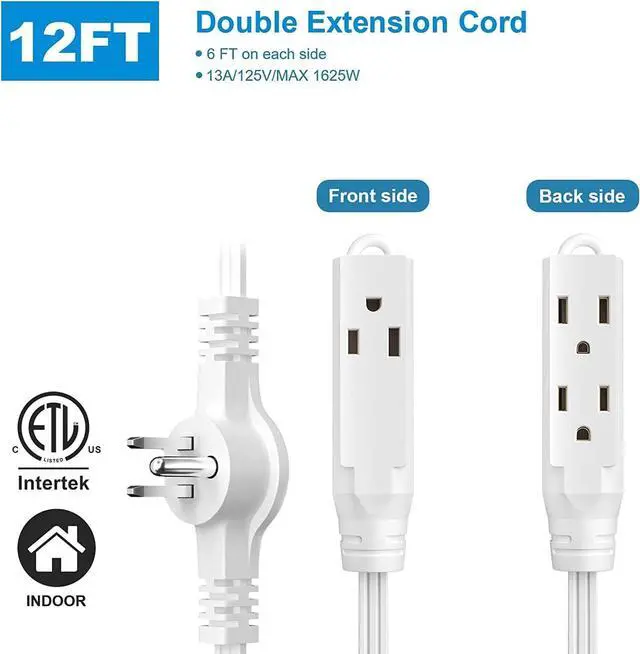12 Feet Twin Extension Cord - 6 ft on each side. Slim design allows you to hide behind any bed, tv, couch, sofa, computer desk or furniture.