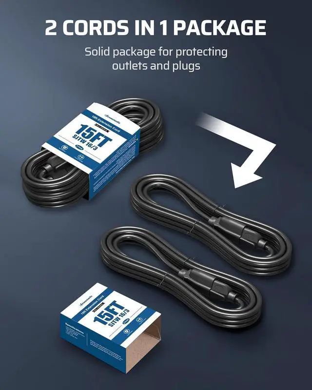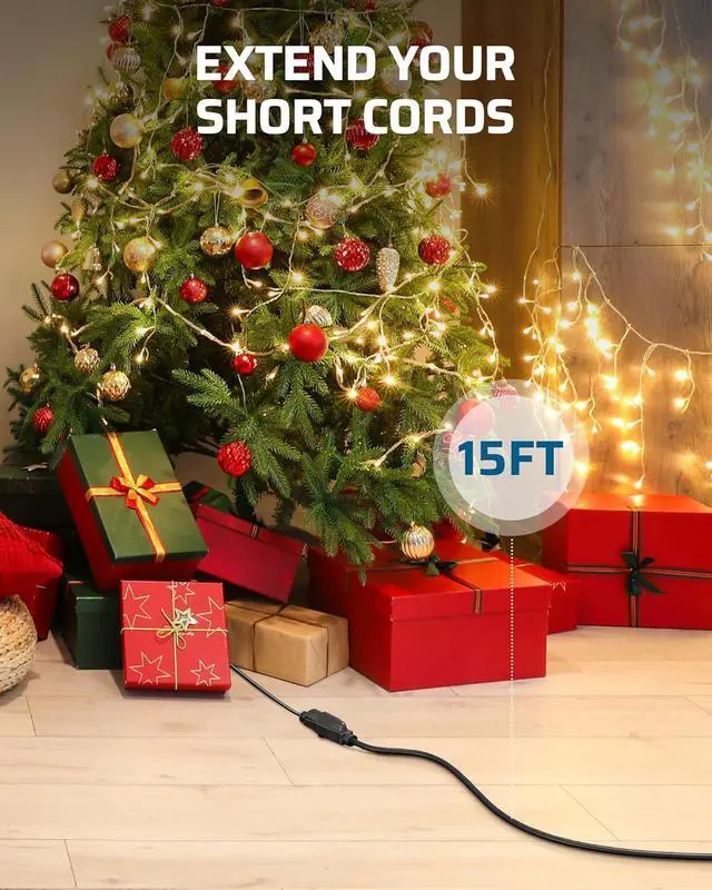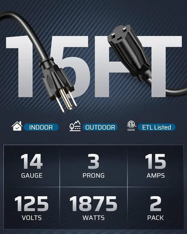 15FT FOR BOTH OUTDOOR & INDOOR USE - 15 Ft extension power cable works with both indoor and outdoor appliances; extend the length of an existing power cord to wall outlets; perfect for hard-to-reach areas behind the furniture; compact plug will not affect the use of other plugs