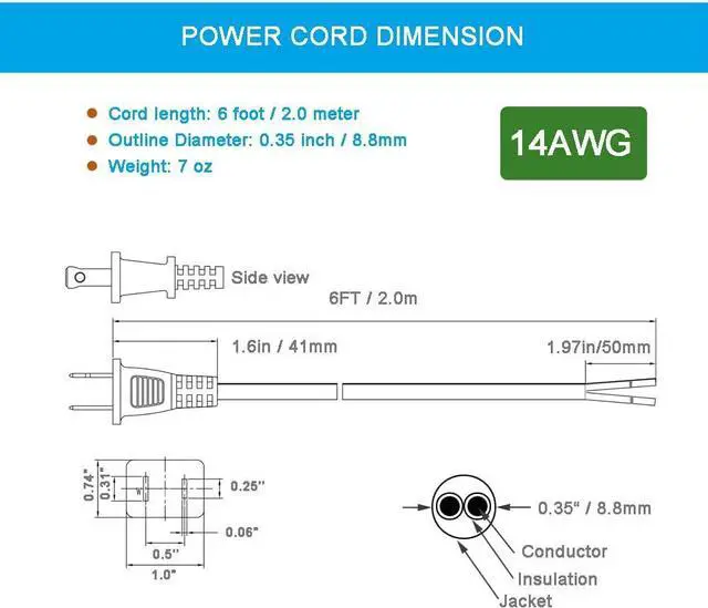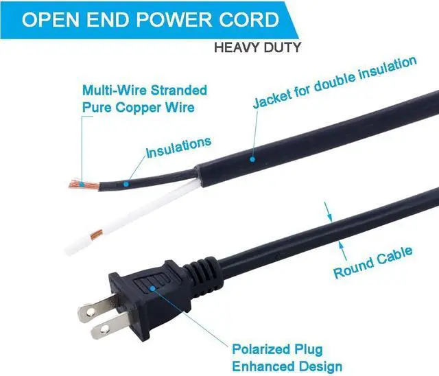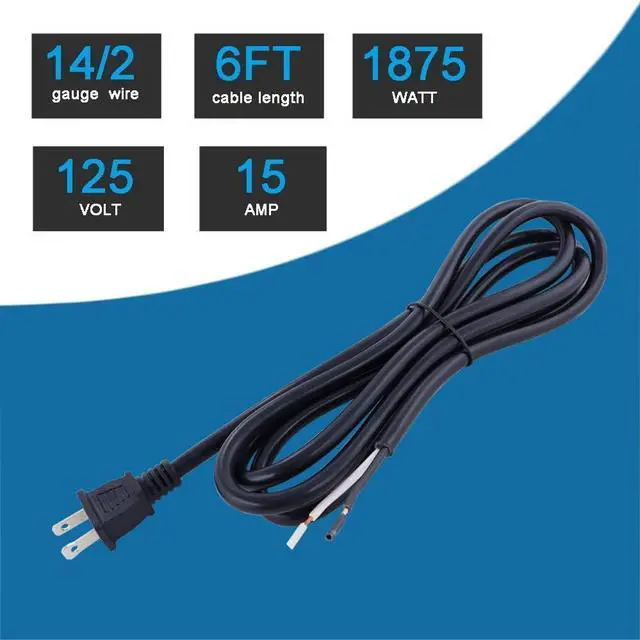 2 Wires, 2 Prong Polarized Plug, 14 AWG cord, 6 foot cord length, 15 amp, 125 Volt, 1875 watt