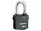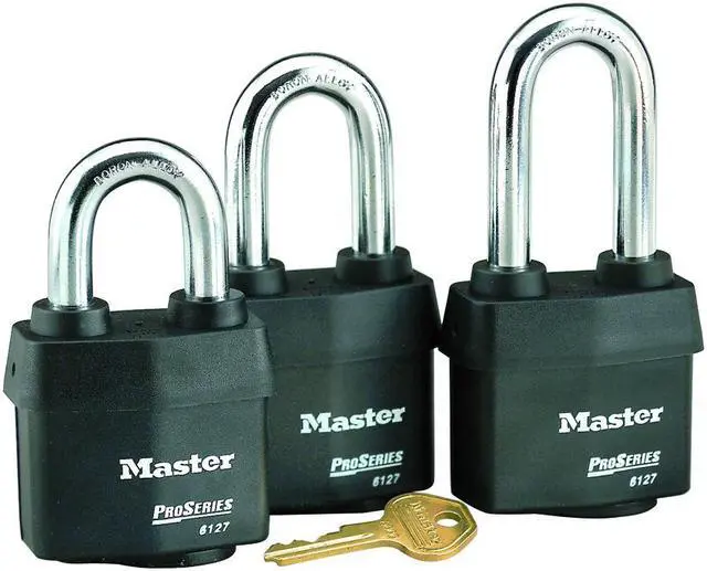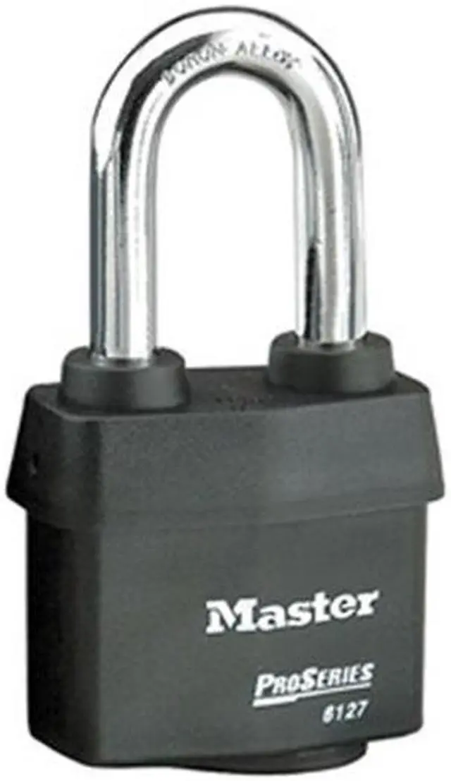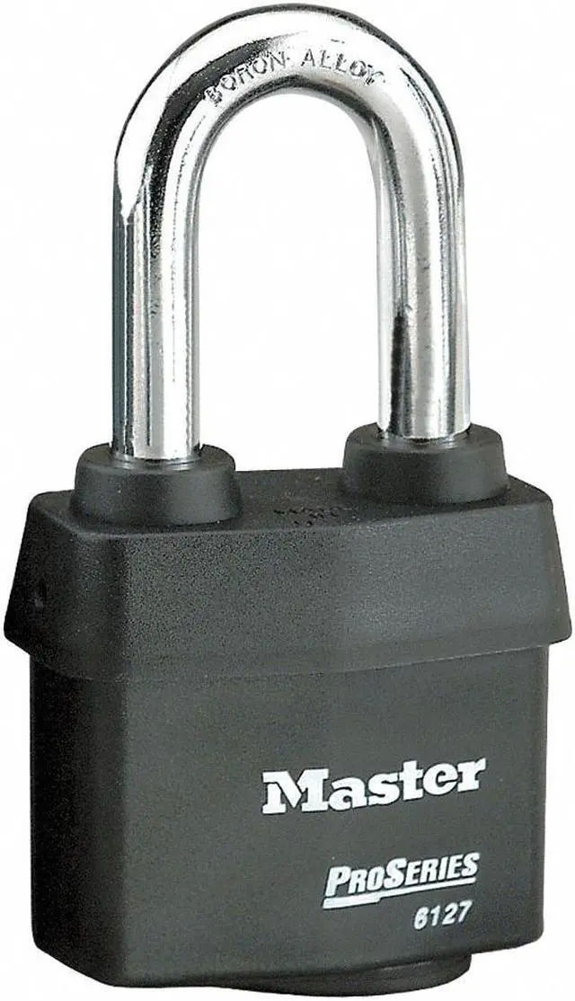 Padlock, Shackle Dia. 7/16 in, Shackle Height 1 7/8 in, Shackle Width 7/8 in, Shackle Material Boron, Body Height 2 13/16 in, Body Width 2 5/8 in, Body Thickness 1 5/16 in, Body Material Steel, Number of Bumpers 0, Number of Pins 5 Pin, Key Type Different, Control Key Registration Required No, Body Color Black, Body Finish Laminated, Keyway Type Master K6000, Weather Resistant Yes, High Security Yes, Interchangeable Core No, Padlock Body Shape Rectangular, Rekeyable Yes. This item has been restricted from sale in the following state (s): []