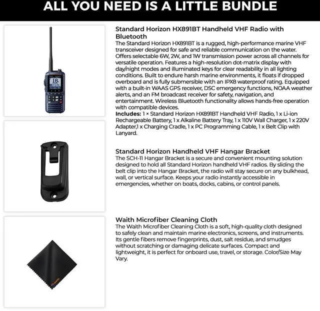 This complete bundle also includes a hangar bracket for secure mounting and a premium cleaning cloth to maintain the display and housing. Together, this kit offers everything needed for safe, convenient, and reliable marine communication.