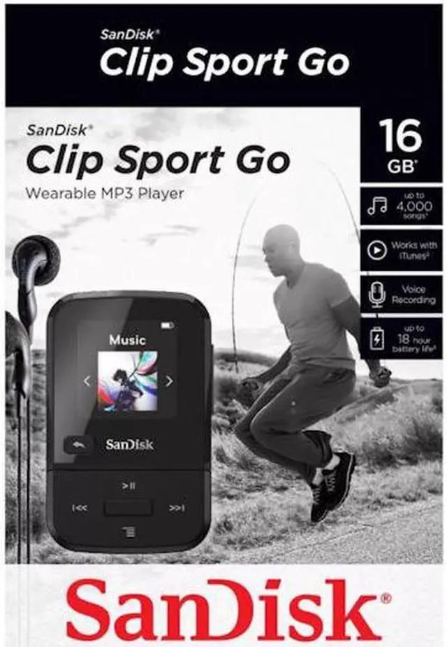 Keep the music on and your phone off with the lightweight Clip Sport Go MP3 player that's designed for your workout. Supporting iTunes and other audio content, its high-performance dynamic acoustic quality makes almost any activity a richer experience. And because it clips on easily, it's perfect for the way you move. The Clip Sport Go player also features a built-in FM radio, along with a high-resolution LED screen and physical buttons that help you easily navigate through your content. Holding up to 4,000 songs (16GB) and up to 18 hours of battery life, your favorite music helps you go the distance.