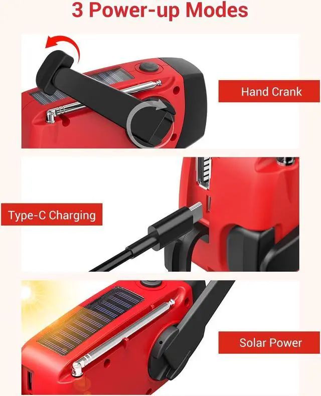 • 3 Charging Modes: No electricity? No worries. Thanks to its 3 charging methods, the emergency hand crank radio is always ready to go!