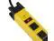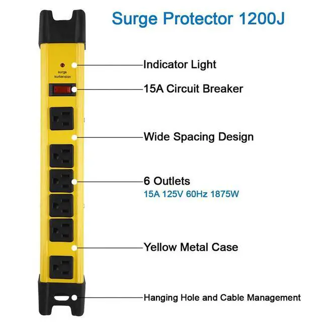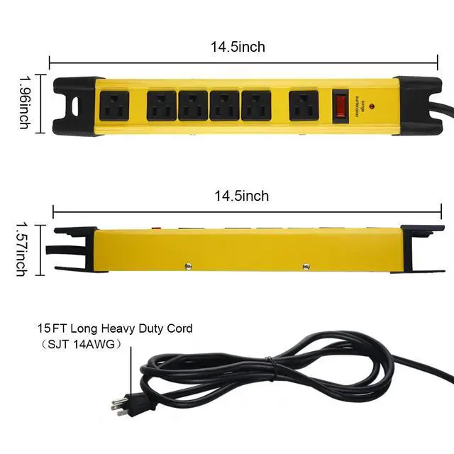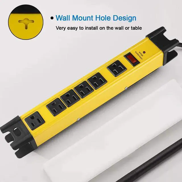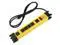 Compact industry metal power strip with 6 outlets, sturdy and durable yellow aluminum alloy.