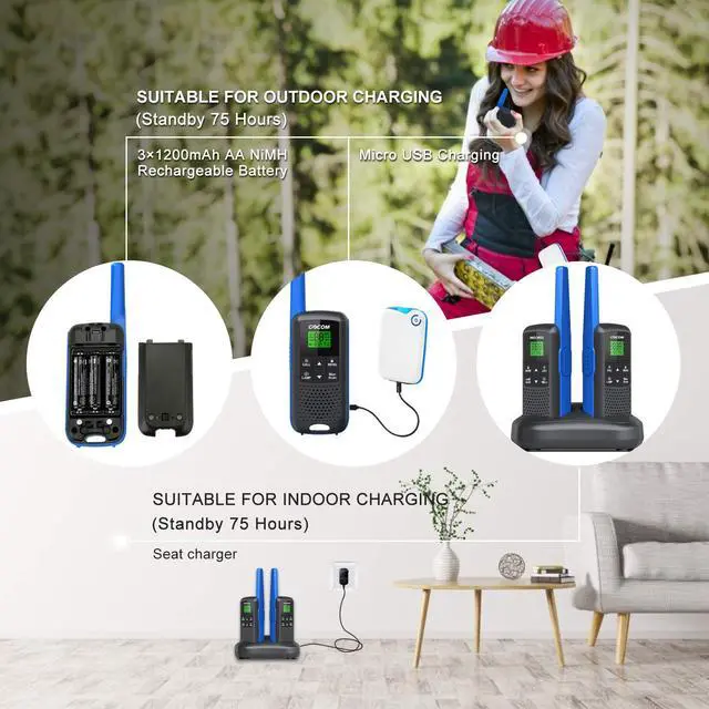There are three ways to power your radio for up to about 15 hours continuous using time and it can standby for about 20 days. 1.Use the included USB quick charger; 2.Use seat charger can charge two at the same time; 3.Get more spare rechargable AA battery.