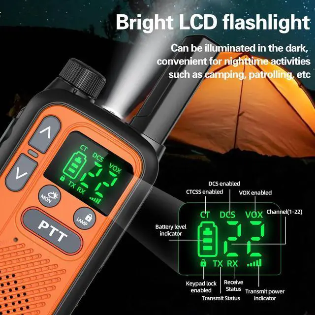 • FRS Professional Walkie Talkies Set : Multi-functional mini walkie-talkie equipped with 22 FRS channels, Voice Activation (VOX),Flashlight,Large LCD, Low Battery Alarm,Keyboard Lock,Volume Adjustment,Channel Scan, 50 CTCSS and 210 DCS Encryption (requiring programming cable)FCC ID:2AJGM-GT18
