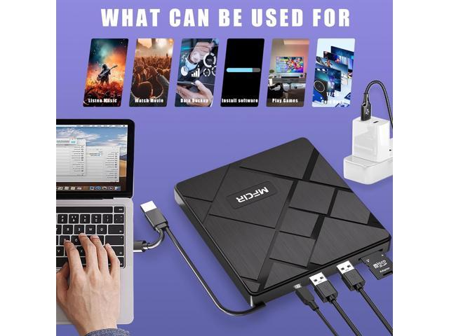 - Easy Plug & Play CD/DVD PlayerNo additional drivers are required for this external cd/dvd drive. Simply plug it into your laptop or desktop pc, insert your cds or dvds, and let our drive do the rest. Enjoy using media player, burning, or ripping software to read, write, and rip your discs!