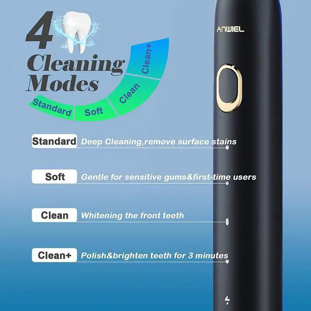 MINS TIMER: 4 brushing modes-STANDARD, SOFT, CLEAN and CLEAN+. You can choose the most comfortable mode according to your teeth condition. Travel toothbrush built in a 2 or 3 minute smart timer with 30-second interval time reminds you of replacing brushing area for an effective clean, it can encourages you to achieve the dentist-recommended brushing habit