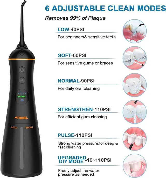 6 CLEANING MODES & UPGRADED DIY MODE: LOW-40PSI, SOFT-60PSI, NORMAL-90PSI, STRENGTHEN-110PSI, PULSE-110PSI and UPGRADED DIY Mode-10~110PSI to meet various oral care needs. Professional oral irrigator brings you new DIY mode, you can choose the most comfortable water pressure (10-110PSI) from low to high 8 gears