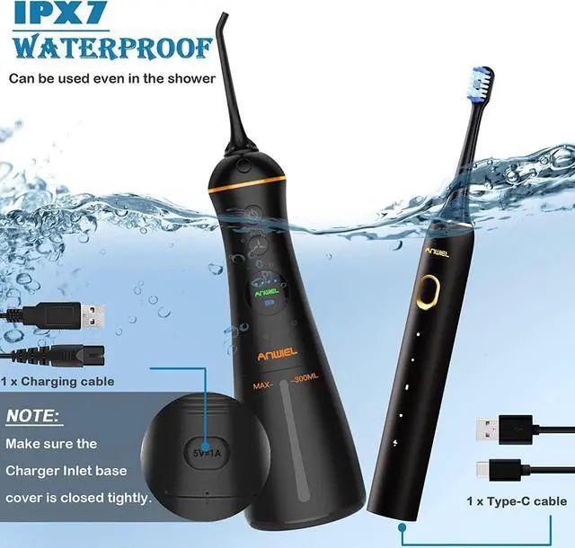 IPX7 WATERPROOF & 60 DAYS BATTERY LIFE: IPX7 waterproof design you can easily use the electric water flosser and toothbrush in the bathroom (water flosser rubber lid needs stay in the charging slot during the using). Rechargeable water flosser and toothbrush with powerful lithium battery with the latest technology, fully charged in just 4 hours, and used continuously for about 30 days. Come with USB Cable (Adapter Not Included)