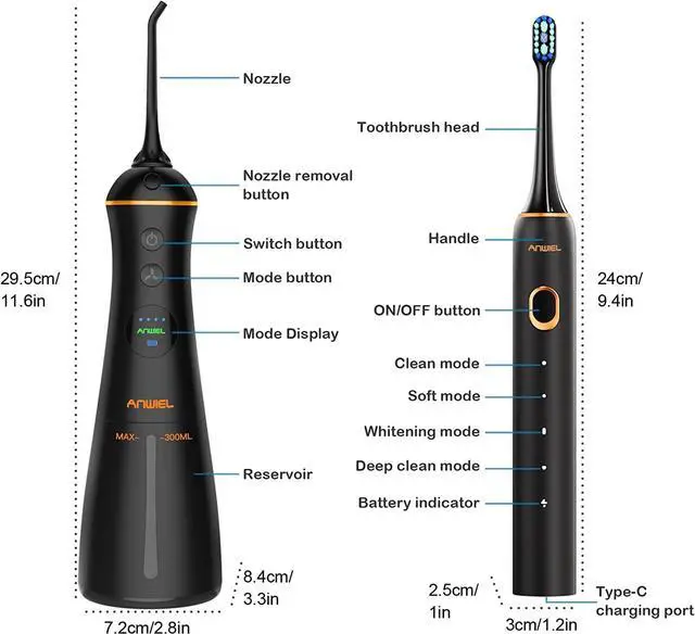 ORAL HEALTH GIFT SET: 1 x Water Flosser, 1 x Ultrasonic Electric Toothbrush, 4 x Standard Tips, 2 x Orthodontic Tips, 4 x Brush Heads, 1 x Water Flosser Charging Cable, 1 x Toothbrush Type-C Cable, 1 x User Manual. Best gift choice for family and friends. If you have any questions or need help, please simply e-mail us the problem at any time. We promise to response you within 24 hours.