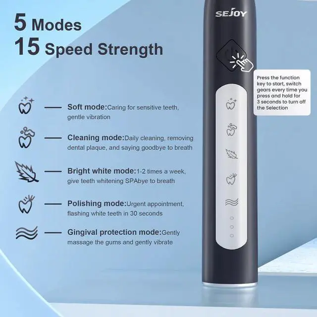 Features: Auto Shut-Off, Charging Indicator, Ergonomic Design, Fast Charge, Firm Bristles, Multiple Cleaning Modes, Rechargeable, Replacement Heads Included, Travel Case, USB Charger