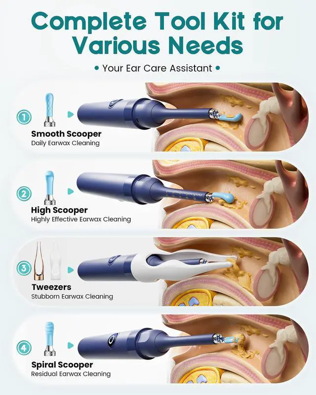 Multifunctional Ear Care: Loyker ear cleaning kit comes with 12 ear spoon tips & 4 ear canal cleaning modes. You can freely switch between low & high scooper as needed. Tweezers can remove stubborn earwax. Residual earwax can be removed with a spiral scooper