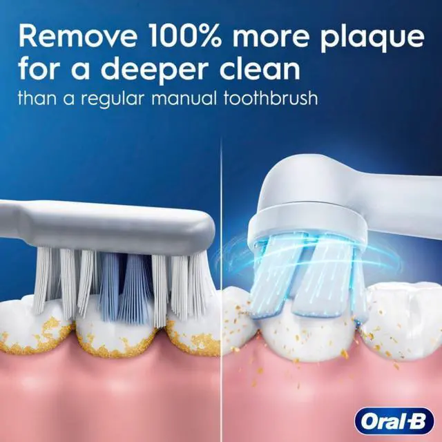 REMOVES 100% MORE PLAQUE vs a regular manual toothbrush with Oral-Bs MOST ADVANCED TECHNOLOGY iO: TOUGH ON PLAQUE, GENTLE ON GUMS