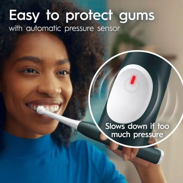 PROTECT YOUR GUMS with the AUTOMATIC GUM PRESSURE SENSOR that slows down speed and signals red when you brush too hard