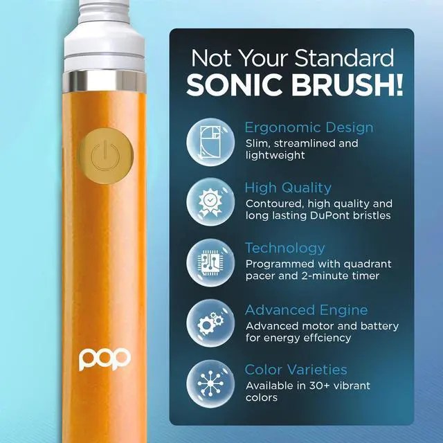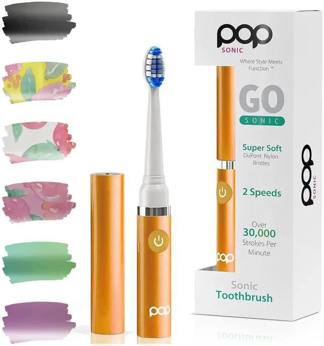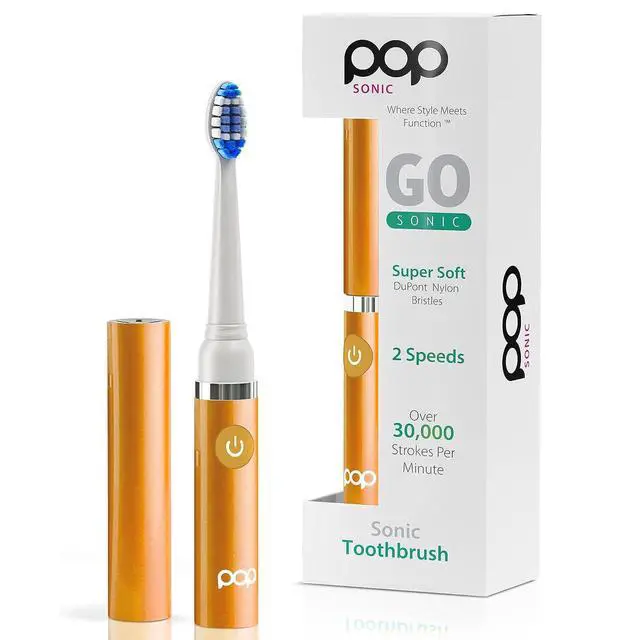 Pop Sonic Battery Operated Toothbrushes (Orange): Our battery tooth brush delivers style along with a brighter, whiter smile. The powerful vibration of our toothbrush cleans your mouth, whitens your teeth, and freshens your breath - all in one quick brushing session. Our 7 tall battery-powered tooth brush mechanical is perfect for home, gym, and everywhere you need because fresh breath knows no boundaries. Our vibrating toothbrush adults are ergonomically designed with high-quality nylon bristles. The battery tooth brushing for kids is programmed with a quadrant pacer with a 2-minute timer. This battery operated travel toothbrush has advanced motor features and a battery for energy efficiency. With a smaller size, these are perfect for little hands aged 8+, will have them brushing longer, and provide a deeper, more effective clean than regular toothbrushes. Battery Operated Tooth Brush Features: Toothbrush vibration rate: up to 30000 strokes per minute - 2 speeds - Replaceable battery toothbrush heads - Battery use: One AAA type battery. How to Insert the Go Sonic powered toothbrush: Turn the battery cover counter-clockwise and pull down the corner to remove it. Insert the battery with polarity as directed. Replace the battery cover and turn clockwise until the battery cover is securely in place. --- About Us: We all want to look our best and pamper ourselves. We all come in different shapes, sizes, and colors and we all have different needs. So we asked ourselves, "Why can't our skincare and oral care products be more like us? Why can't they come in different shapes, sizes, and colors AND be affordable?" At Pop Sonic, we set out to create the highest quality products while making skincare and oral care affordable AND a lot more fun.