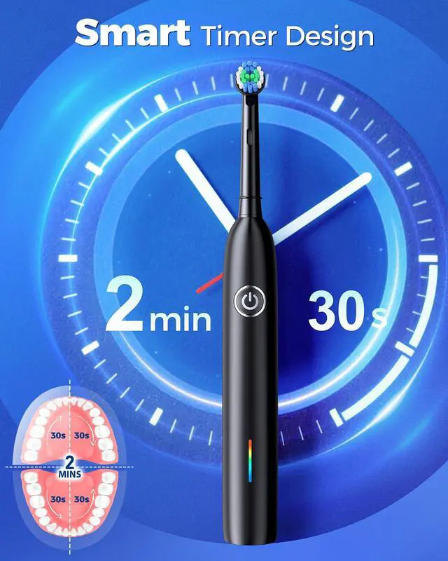 Promotes dentist-recommended brushing habits with automatic 30-second pulse reminders to switch zones and a final vibration after 2 minutes.