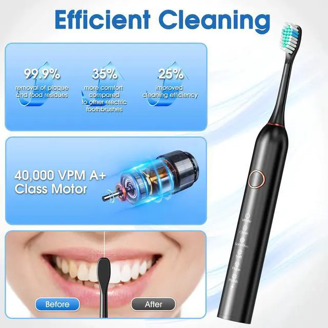- - This electric toothbrush comes with 8 premium brush heads and a sleek travel case, ensuring you have everything you need for a long-lasting and convenient oral care routine, whether at home or on the go. The high-quality brush heads are designed to effectively clean every corner of your mouth, while the travel case keeps your toothbrush safe and protected during your travels.