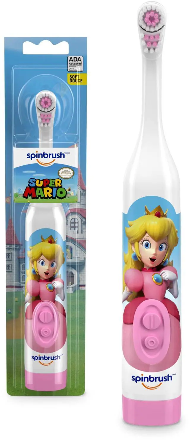 This Princess Peach Kid's Spinbrush Electric Battery Toothbrush features small, soft-bristle powerheads that make it an ideal children's toothbrush to fit smaller mouths. Stationary lower bristles are topped with a spinning head to clean, even in between teeth. The specially designed motorized toothbrush fits perfectly into little hands for a comfortable grip. Meet the NEW Kid's Spinbrush with FASTER spinning action and LONGER battery life! For clean and healthy teeth and gums, choose a Spinbrush battery-powered toothbrush, soft on children's mouths.