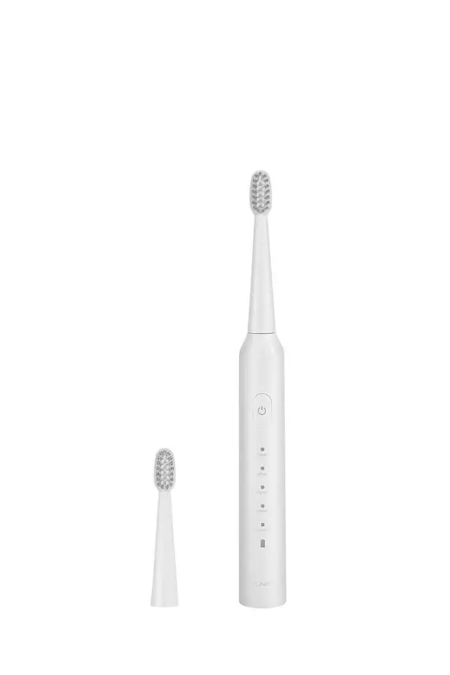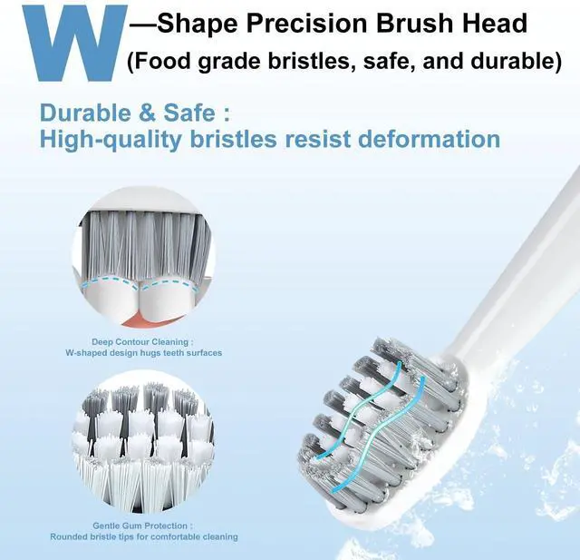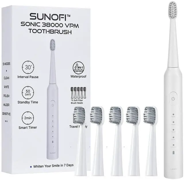SunoFi sonic electric toothbrush is designed for adults seeking a personalized and effective oral care routine. Featuring five unique cleaning modes and a precision W-shaped brush head, it delivers a deep yet gentle clean tailored to your needs. With just one charge, enjoy up to 50 days of use, and five included brush heads provide up to 15 months of hygiene. The IPX7 waterproof rating and ergonomic anti-slip handle make it safe for shower use and convenient for travel. A built-in 2-minute timer with 30-second intervals ensures thorough, dentist-recommended brushing every time.