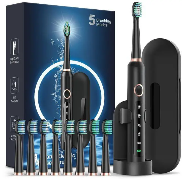 Rtauys Electric Toothbrush for Adults, 8 Brush Heads & Travel Case,5 Modes with 2 Minutes Built in Smart Timer, One Charge for 120 Days, 41000 VPM Motor (Black)