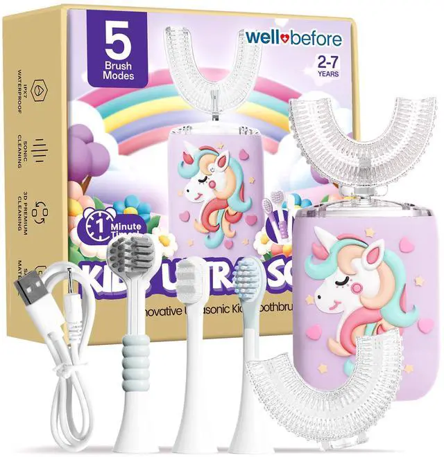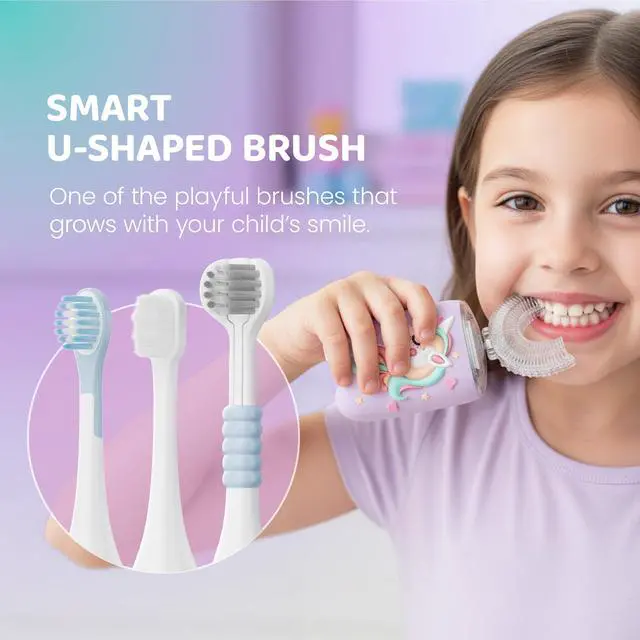 Our Kids Electric Toothbrush with U-shaped design is perfect for toddlers, children, and kids aged 27, offering gentle and effective cleaning for sensitive teeth and gums. Made with food-grade silicone and soft bristles, it comes with 4 replaceable brush heads (2 U-shaped silicone and 2 soft bristle) for complete oral care. This rechargeable automatic toothbrush features 5 cleaning modesstandard, gum care, whitening, deep cleaning, and gentle modemaking it ideal for daily dental hygiene, plaque removal, and cavity prevention. With IPX7 waterproof protection, anti-drop silicone body, and a cute cartoon design, this kids electric toothbrush is safe, durable, and fun to use in the bath or shower. Perfect as a childrens sonic toothbrush, toddler electric toothbrush, or ultrasonic toothbrush for kids, it helps develop healthy brushing habits while ensuring bright smiles and stronger teeth.