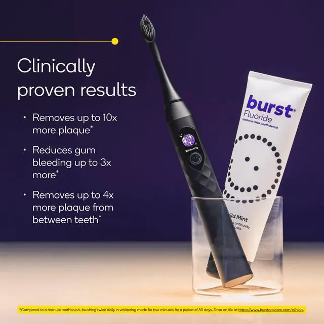 *The BURST Pro Sonic Toothbrush removes up to 10x more plaque, provides healthier gums in 2 weeks, and reduces bleeding gums 3x after 30 days compared to a manual toothbrush as shown in two independent, 30-day single-blind clinical studies of 92 and 97 healthy subjects, respectively, with mild-moderate levels of plaque and gingivitis. The subjects brushed twice daily using a fluoride toothpaste with either a manual toothbrush (control group) or with the BURST Sonic Toothbrush (experimental group). These results were collected in Aug 2019 by Salus Research, Inc. and All Sum Research Center Ltd. in compliance with ICH Good Clinical Practices (GCP) including the archiving of essential documents and compiled in the report "Plaque and Gingivitis Efficacy of a Sonic Toothbrush: Two Thirty-Day Independent Studies" (PTB-001-2019 & PTB-002-2019).