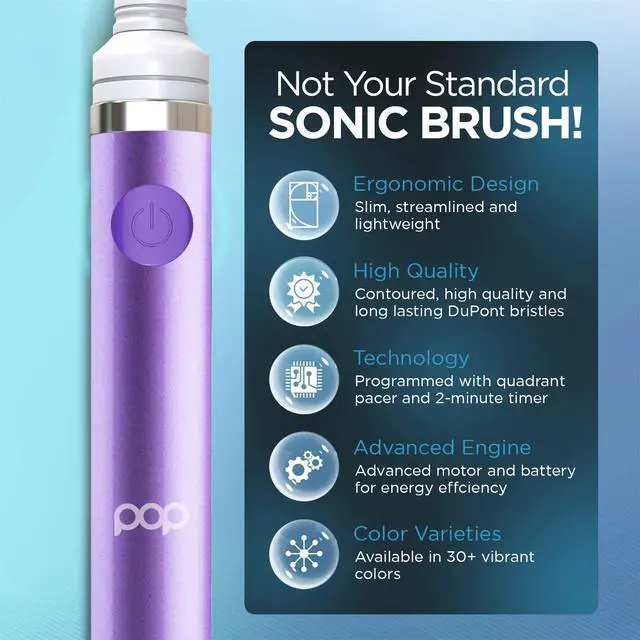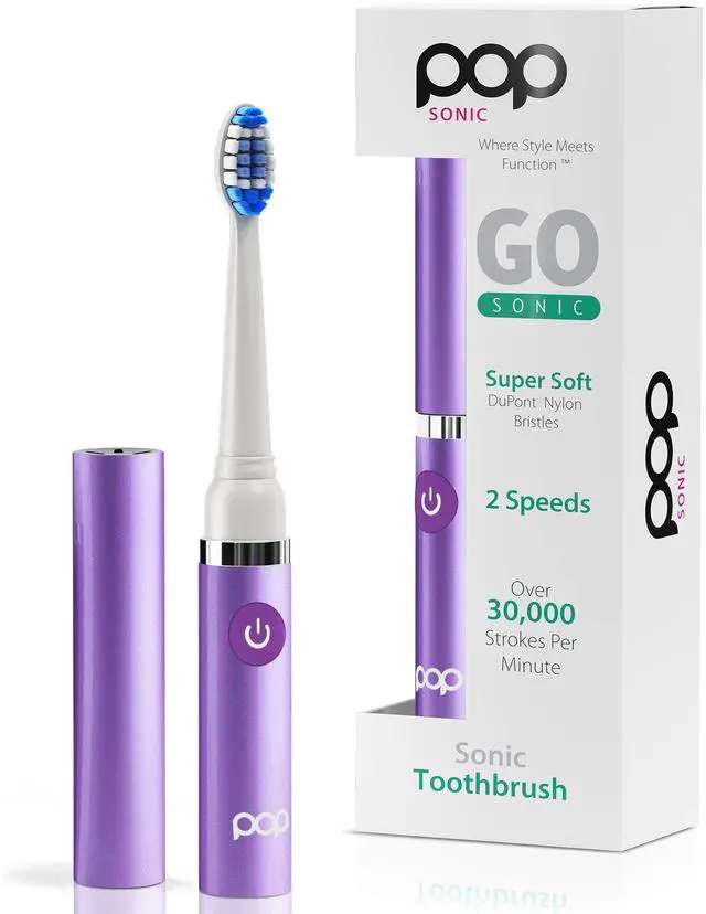 • Battery Toothbrush for Adults & Kids: Keep your teeth clean and breathe fresh all day long with our Purple Go Sonic toothbrush by Pop Sonic. This 7 tall vibrating Sonic travel toothbrush features 2 speeds with vibrations from 15000 to 30000 brush strokes per minute.