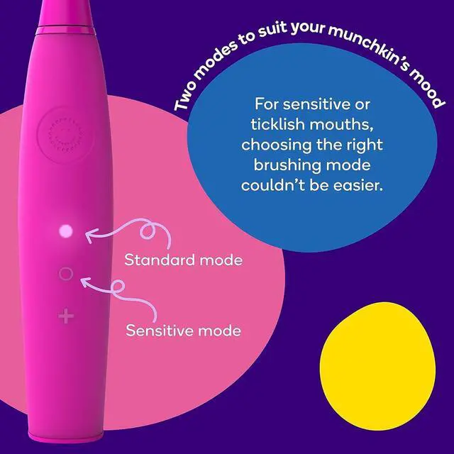 Toggle between sensitive mode for ticklish mouths or tender gums and standard for full power.