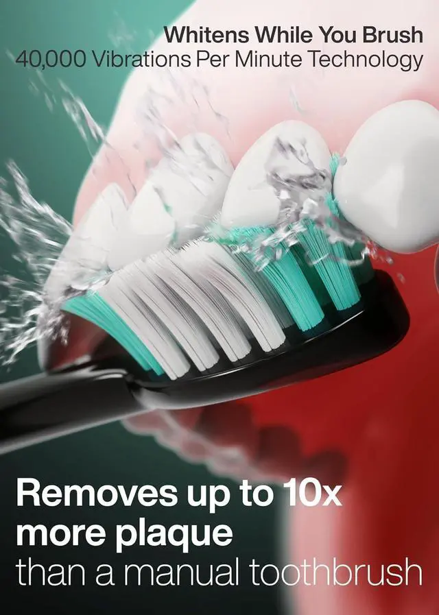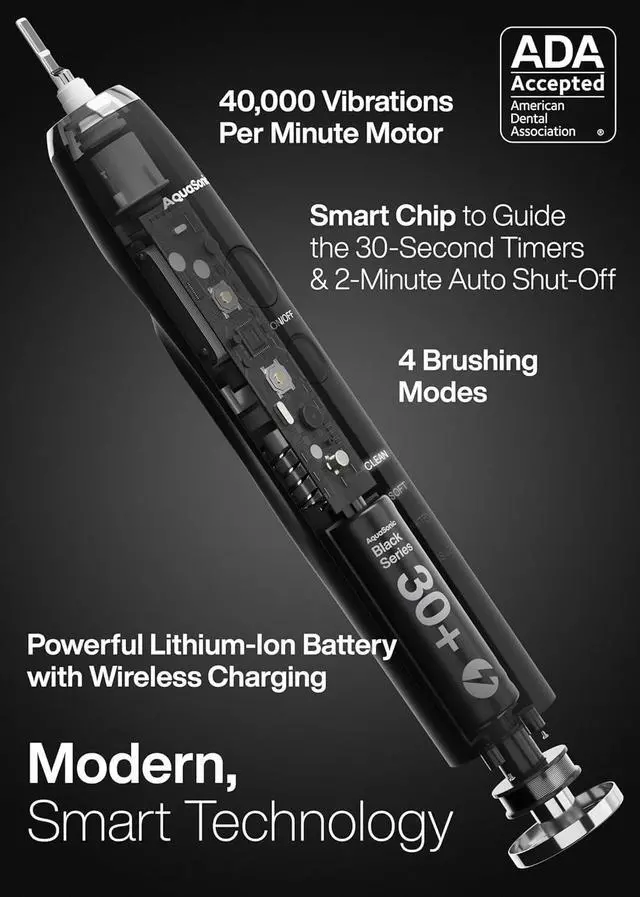 40,000 VPM Smart Toothbrush Beauty, brains and power. The Black Series is a world class modern electric toothbrush packed with the most up to date technology. It features an ultra-powerful and industry leading motor producing 40,000 vibrations per minute, a lithium-ion battery, ultra-fast wireless charging, 4 mode operation, smart vibration timers, 8 DuPont engineered brush heads, and a custom travel case; all with a sleek ultra-slim, lightweight and IPX7 rated waterproof design.