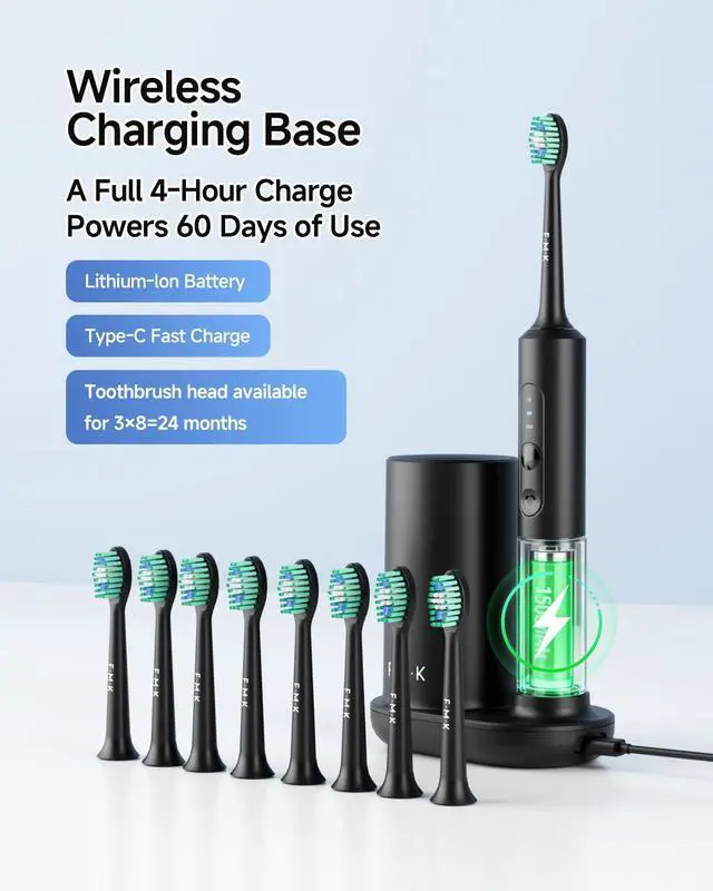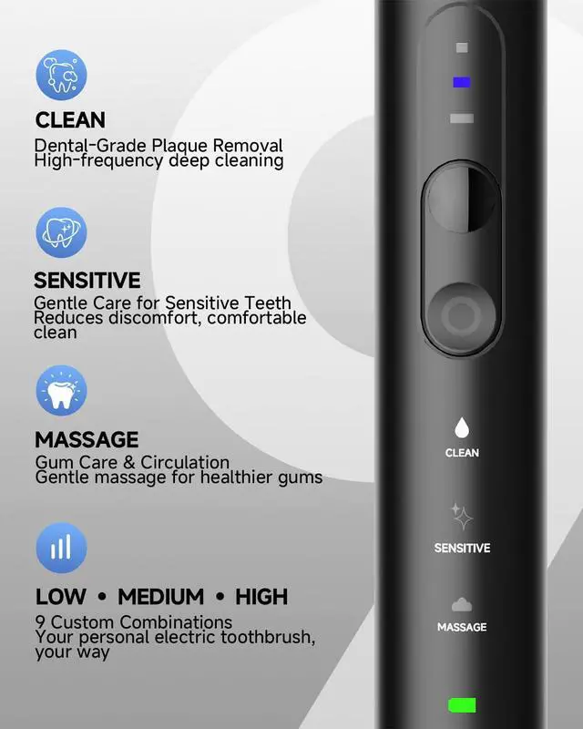 Customize Your Clean with 9 Settings: Find you suitable brush with 9 combinations. Choose from clean, sensitive, or massage modes, then customize the intensity to low, medium, or high. Whether you have sensitive gums or prefer a deep scrub, eletric toothbrush adapts to you