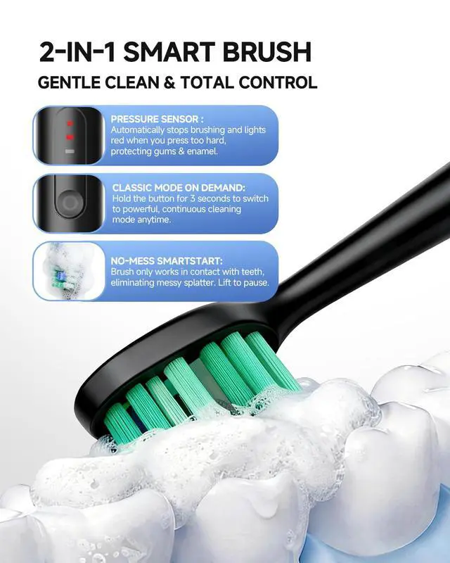 2-in-1 Anti-Splash Brushing Mode: Vibrating toothbrush adults features a convenient dual-function design that allows you to switch between standard brushing and a specialized anti-splash mode with the touch of a button, helping to prevent toothpaste from splattering while you brush, electric toothbrush with pressure sensor