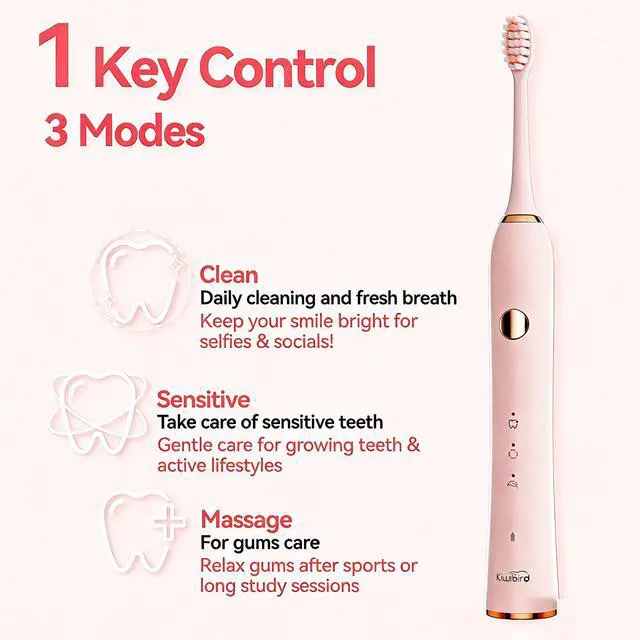 The KIWIBIRD K1 MINI Sonic Electric Toothbrush is the perfect blend of stylish design, gentle cleaning power, and ultra-portabilitymade specifically for teens ages 1018. Powered by high-frequency sonic vibrations (31,00040,000 VPM), it deeply cleans teeth and gently protects sensitive gums, ideal for teenagers with delicate oral care needs. At only 85g and slimmer than a lipstick, this compact toothbrush is made for teen life on the go: perfect for school, dorms, sports, travel, camping, or daily outings. It features an impressive 90-day battery life and IPX7 waterproofing, so its reliable and easy to use anywhere. Unlike bulky toothbrushes, the K1 MINI comes with a vegan leather travel pouch for clean, convenient storage. It also uses food-grade soft bristles and supports fast USB-C chargingcombining safety, hygiene, and modern teen lifestyle. Stylish, lightweight, and effective, the KIWIBIRD K1 MINI is the ideal daily oral care companion for teens at home, school, or on the road.