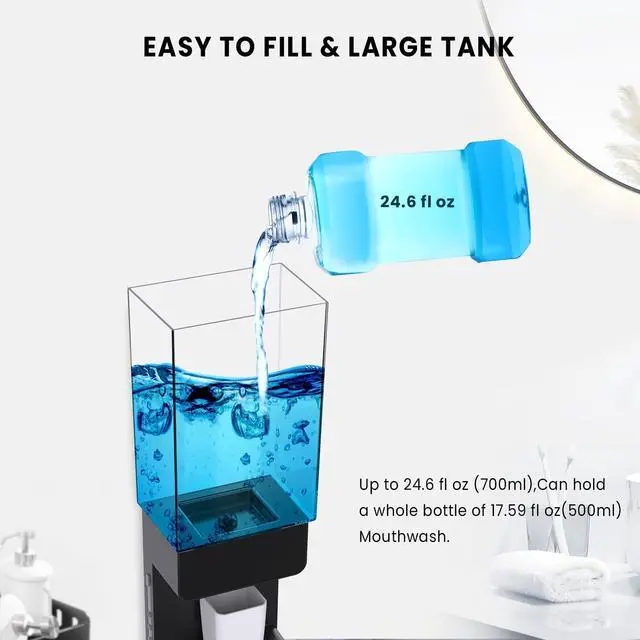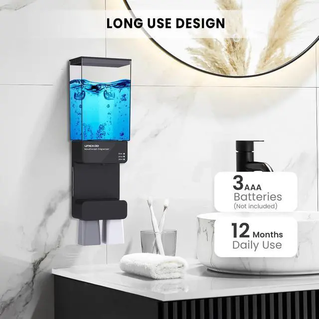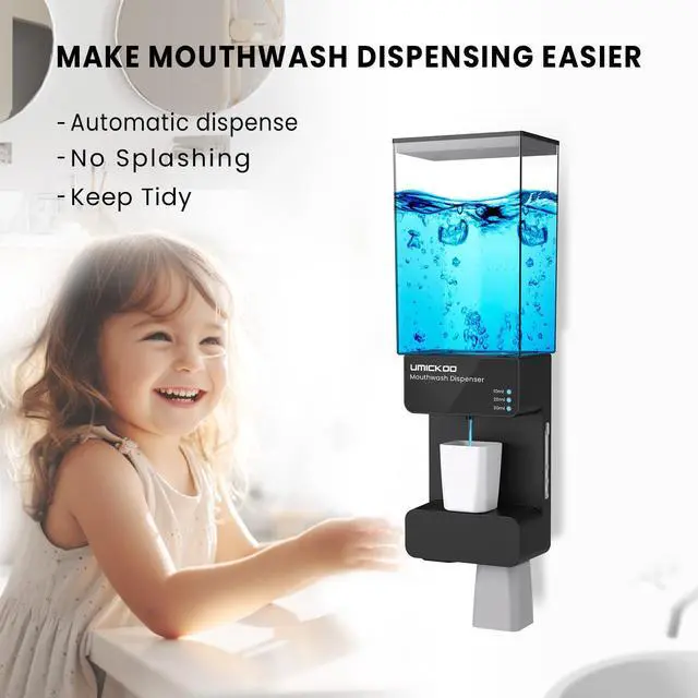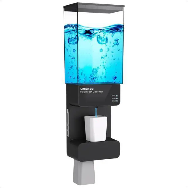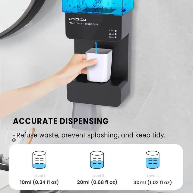 EASY & HEALTHY DISPENSINGWith the unique design, place the magnetic cup at the liquid outlet,will automatic dispense quantitative mouthwash you set.Say goobye to the splash and waste by the traditional mouthwash dispenser,make your bathroom more tidy.